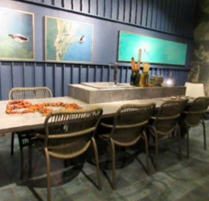 Bancada: Personalizada e desenhada, a bancada foi criada para atender o projeto, em tamanho, textura e praticidade. Normalmente se escolhe porcelanatos de boa resistência e formatos maiores.
